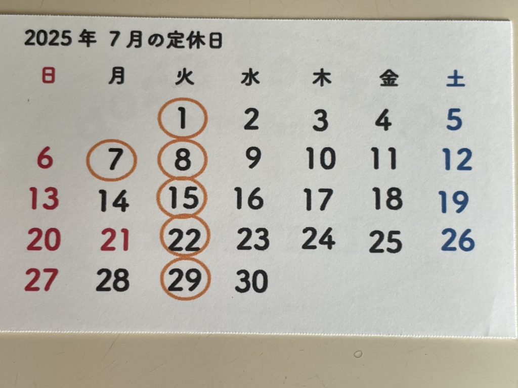 定休日のお知らせ2025.07